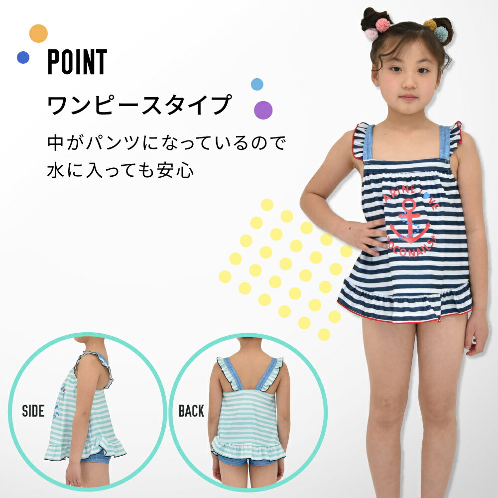 【期間限定10%OFF】ROCO NAILS イカリプリントボーダーフリルワンピース水着 マリン柄 女子 キッズ 水着 子供 100cm 110cm 120cm 130cm 一体型 裏地付き 透けない 子供 スイムウェア 幼稚園 スカート デニム メール便送料無料 a-i-o