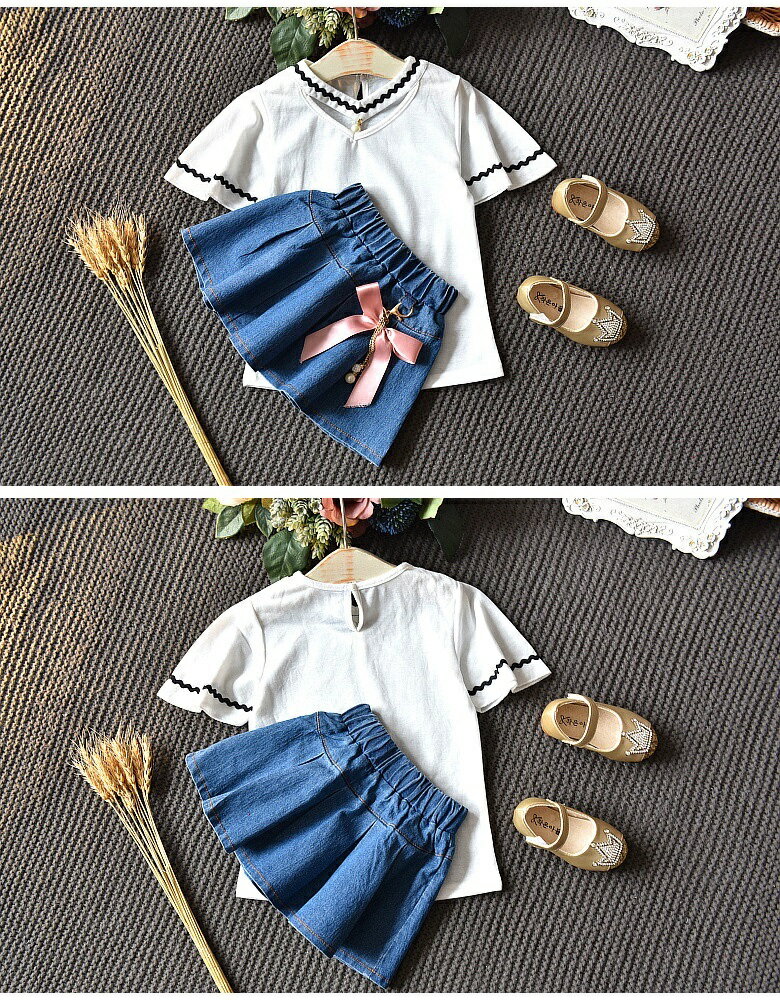 送料無料セットアップ 2点セット 上下セット Tシャツ デニムスカート 子供服 キッズ 女の子 トップス ボトムス 半袖 丸首 ラウンドネック リボン フェイクパール 無地 ホワイト ピンク かわいい キュート カジュアル 夏