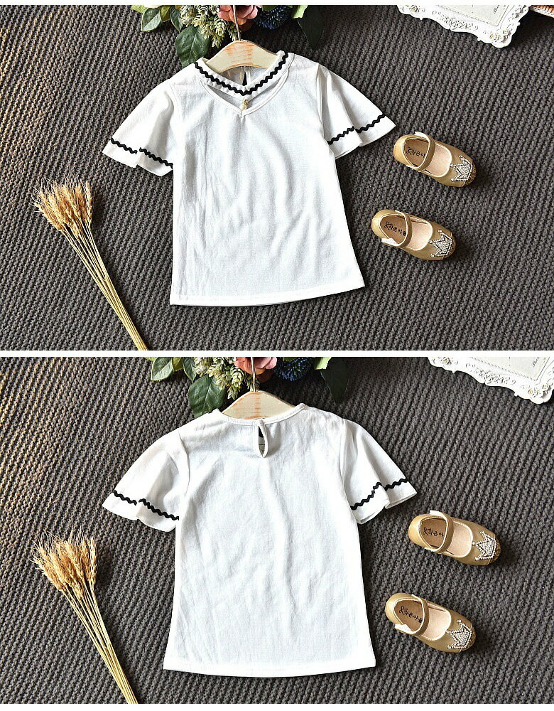Tシャツは無地のシンプルなデザインですが、首元に付けられたフェイクパールや、波型の縁取りがワンポイント♪