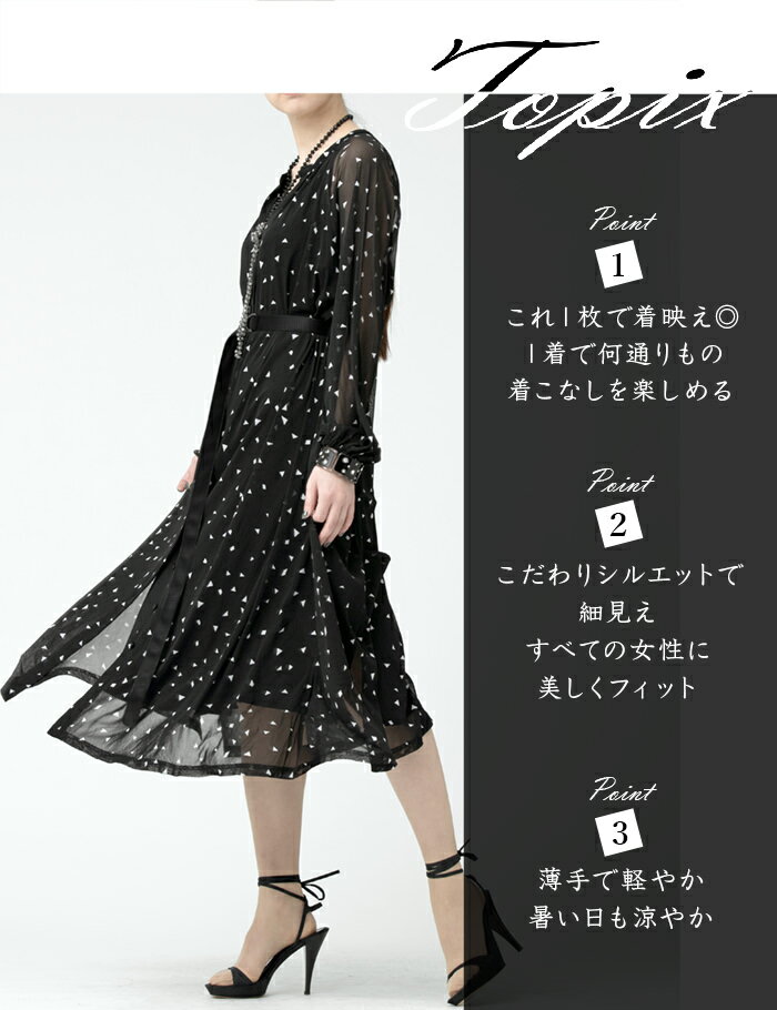ウエストマークしたり、ストンと着たり、羽織にもなり着回し抜群◎ ・1着で何通りものファッションが楽しめて、着こなし次第でいろんな温度や季節に対応出来るのでシーズンレスなアイテムです ・ブラック×ホワイト:幾何学プリント仕様 ・ブラック:無地 ・ソフトパワーネット生地仕様/ストレッチ素材(透けます) ・バンドカラー ・ラグランスリーブ/長袖 ・袖口ゴム仕様 ・フロントボタン ・ロング丈 ・Aラインシルエット ・グログランリボンベルト付(135cm×3cm) ・キャミソール付/ジョーゼット生地 (インナー・ボトムス、アクセサリー等は別売りとなっております) ご注意ください! ※タイトル又は商品説明に記載のない衣類、小物などは付属しておりません ※お使いのモニター環境等によって素材感や色の見え方に違いがある場合がございます-Coordinate Item- ・着用のブラウスはこちら>> -Coordinate Item- ・着用のブラウスはこちら>> -Coordinate Item- ・着用のブラウスはこちら>> ・着用のワイドパンツはこちら>>