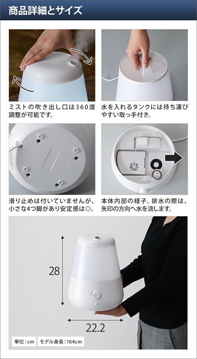 超音波式加湿器C011の主な特徴 【1】最大300ml/時のハイパワー加湿 【2】容量たっぷり3000mlタンク 【3】大きな給水口でお手入れと給水が簡単 【4】水中の雑菌を減らす抗菌カートリッジ付き 【5】アロマオイル対応 【6】インテリアのアクセントになるLEDランプ 【7】ミスト噴霧量は無段階で調節OK 様々な機能がギューッと濃縮したこちらの加湿器は、最大8畳までの広さのお部屋に対応しています。
