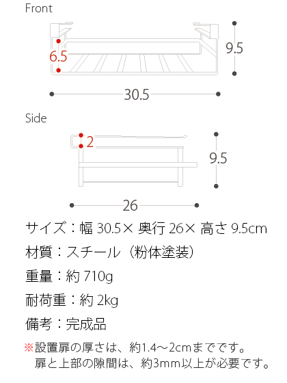 サイズ:幅30.5×奥行26×高さ9.5cm 製品重量:約710g 材質:スチール(粉体塗装) 耐荷重:約2kg 備考:完成品 ※設置扉の厚さは、約1.4〜2cmまでです。