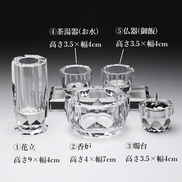 熟練の職人が手作業で心をこめてカット・研磨を施し制作した美しい仏具です花立・香炉・燭台・茶湯器・仏器のクリスタル製5具足セットです ■材質:エコロジークリスタルガラス■サイズ:花立H9×W4cm、香炉H4×W7cm、燭台H3.5×W4cm、茶湯器・仏器H3.5×W4cm ■他店でも同時並行販売をしている関係上、稀にご注文いただいても在庫が切れている場合がございます。